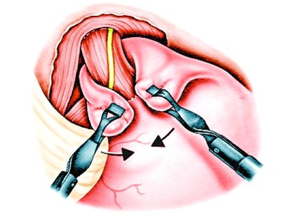 Ameliyatta öncelikle gevşek olan ve fıtıklaşmaya yol açan krusları (diafragma kasları) dikiş ile sıkılaştırılıyor, bazen o bölgeye mesh (yama) konarak onarımın gücü arttırılıyor, daha sonra da mide yemek borusunun etrafına 2180-270 veya 360 derece sarılarak ameliyat sonlandırılıyor.